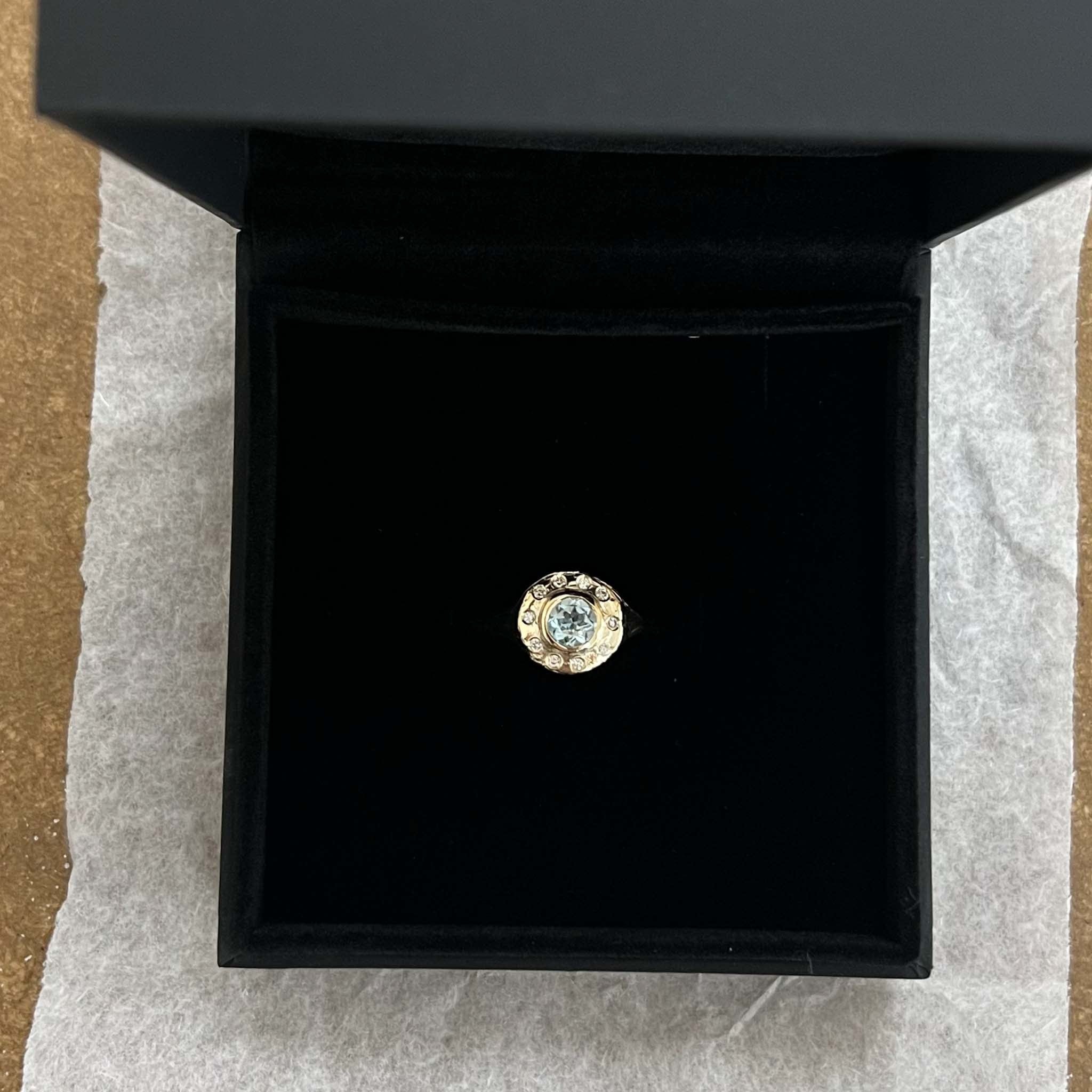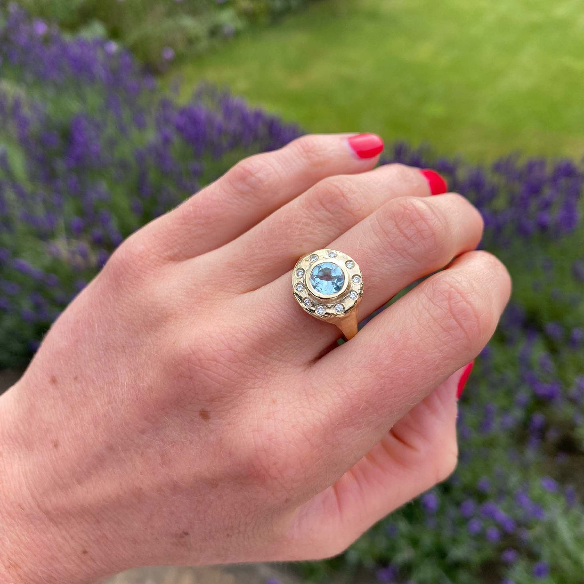 The final piece was cast in solid gold and polished in my studio. A local diamond setter expertly finished the bezel-set light blue topaz and flush-set diamonds, resulting in a stunning showstopper of a ring.