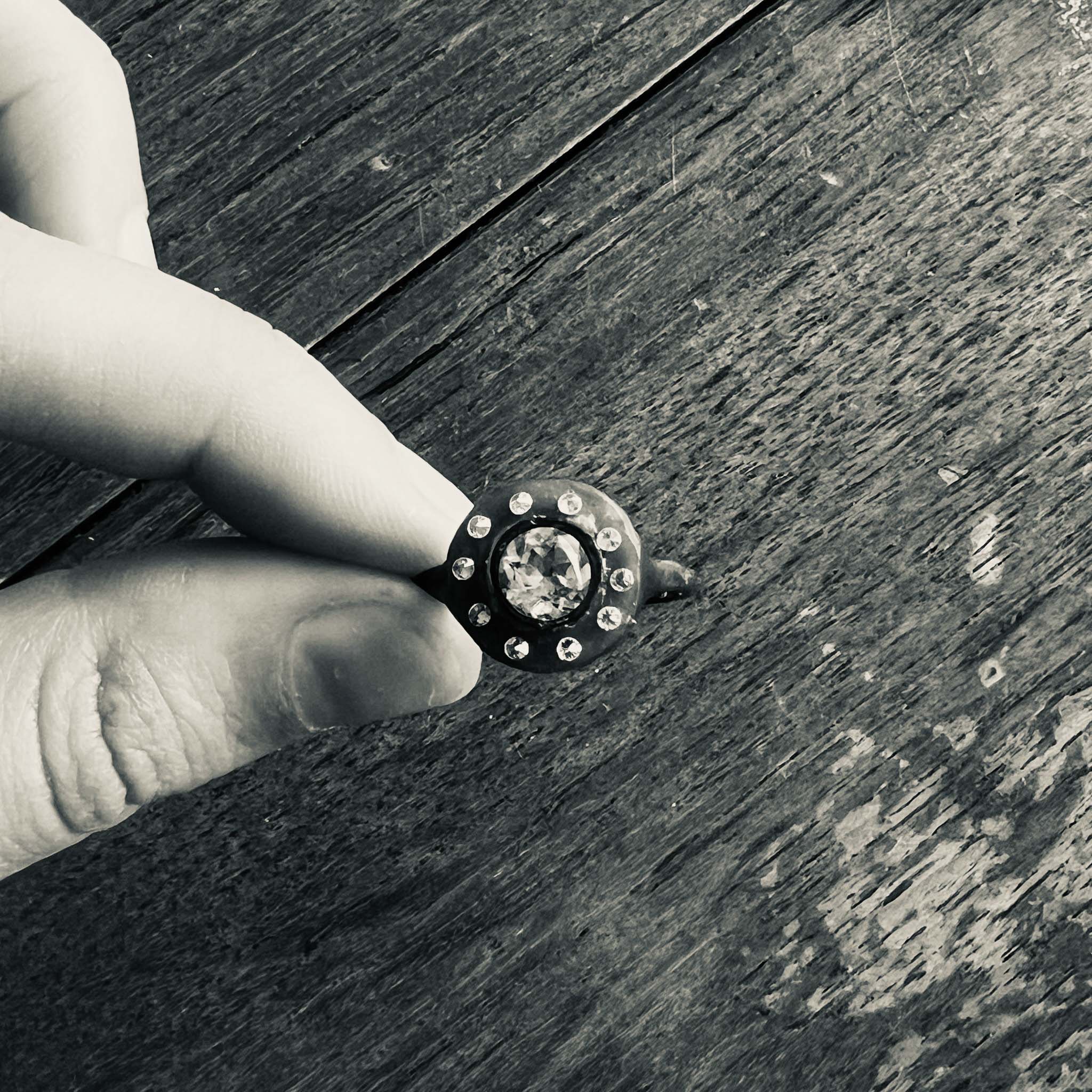 Initially, we designed the ring with an oval-shaped center stone and eight lab-grown diamonds. However, we later decided to switch to a round-cut center stone and added more, smaller diamonds to create the sparkling halo.