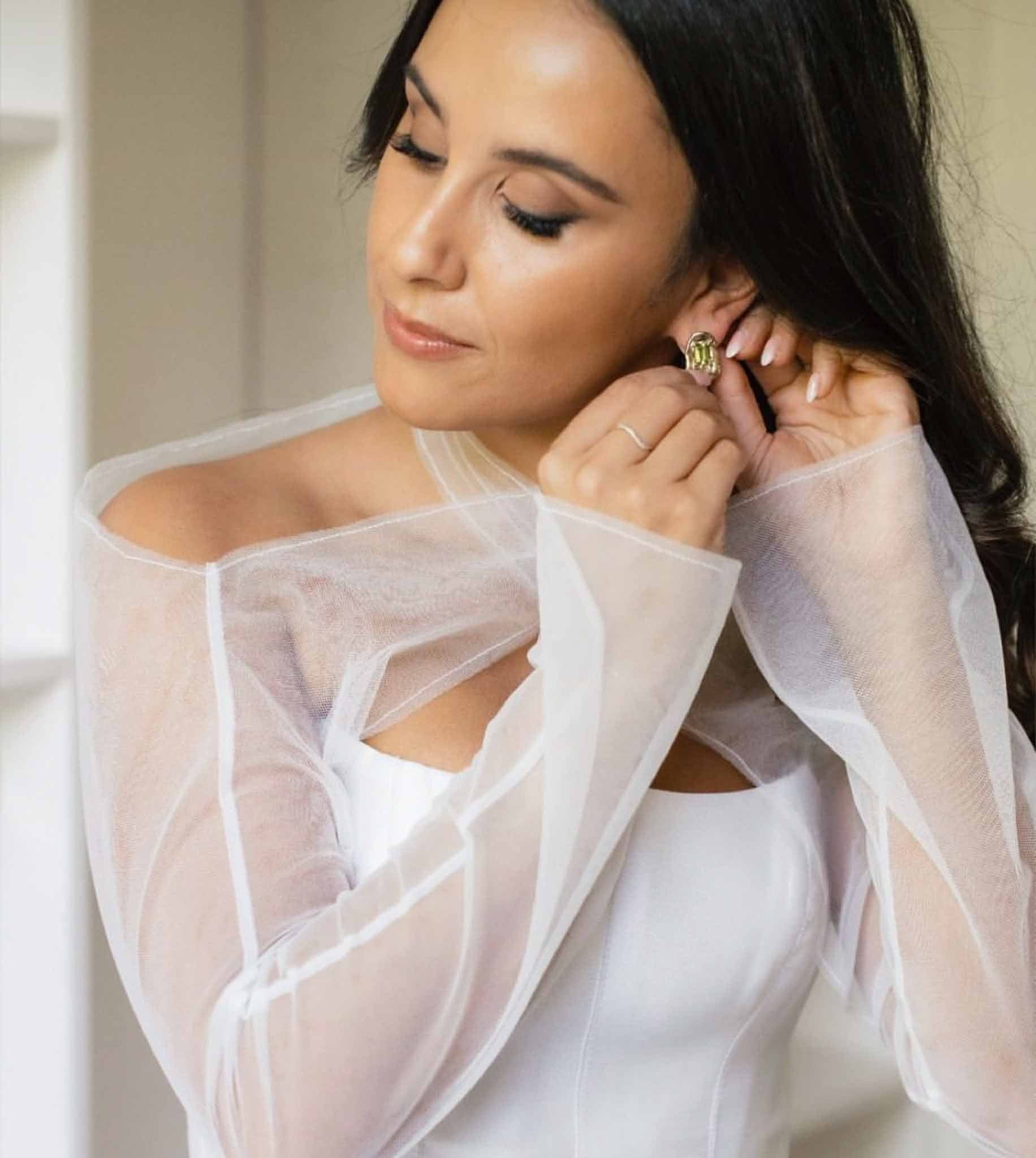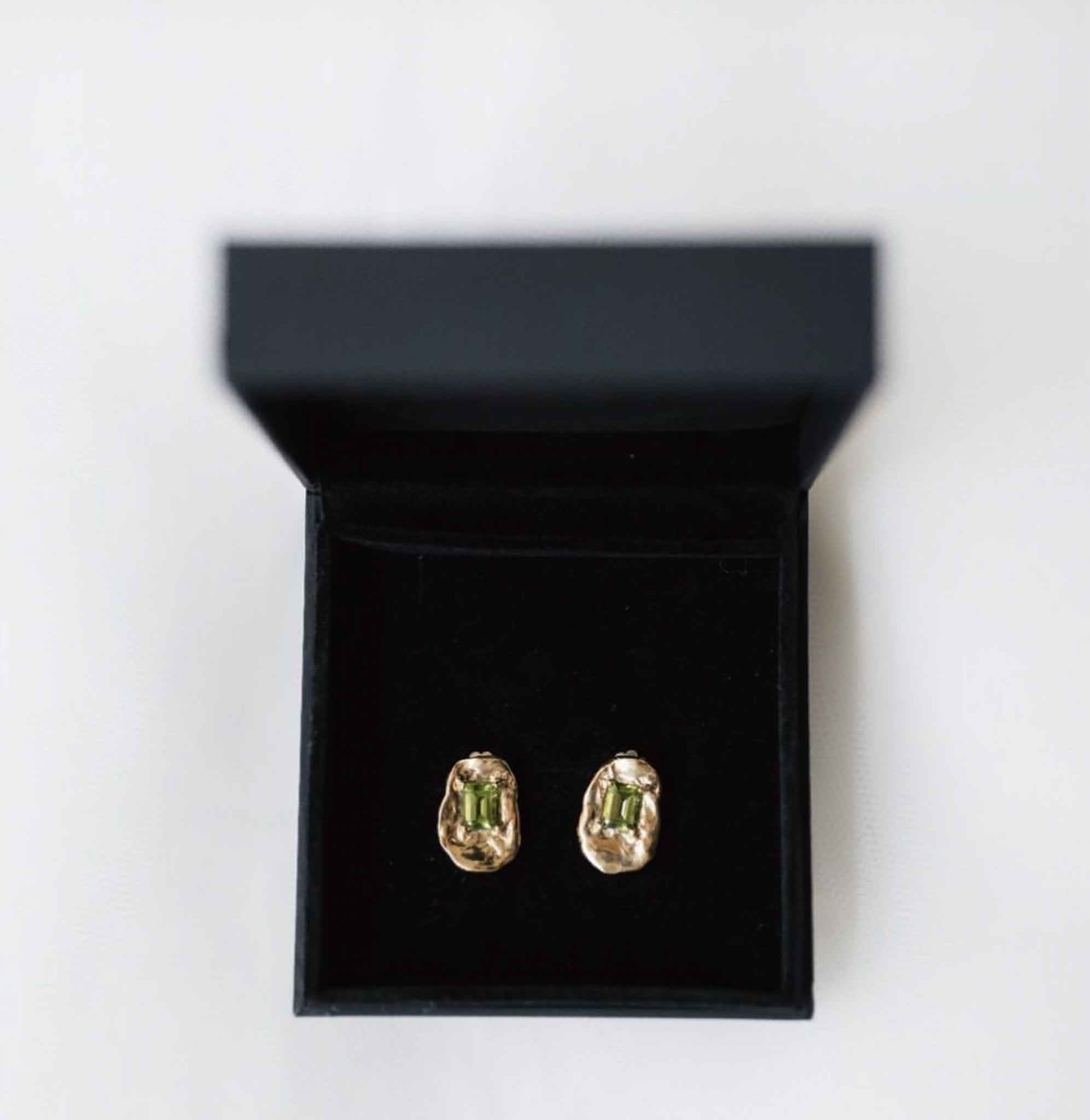 Collaborating together, we designed her earrings—a unique oversized version of our Lolita earrings featuring a vibrant green peridot gemstone.