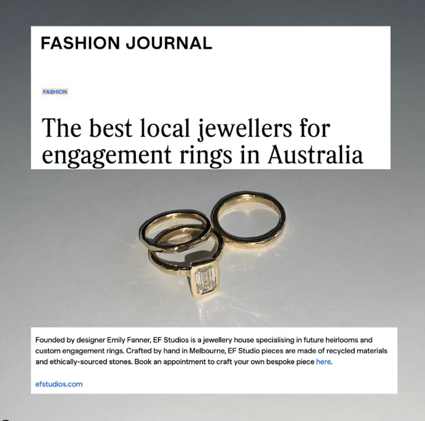EF Studios has received significant acclaim in the jewellery industry, with features in prestigious publications such as Fashion Journal, where we were honoured as one of Australia’s best engagement ring designers. Our innovative designs and commitment to quality have also garnered attention from Harper's Bazaar and InStyle, further establishing EF Studios as a leading destination for bespoke fine jewellery. These features reflect our passion for creating unique, high-quality pieces that resonate with modern sensibilities and celebrate life’s most meaningful moments.