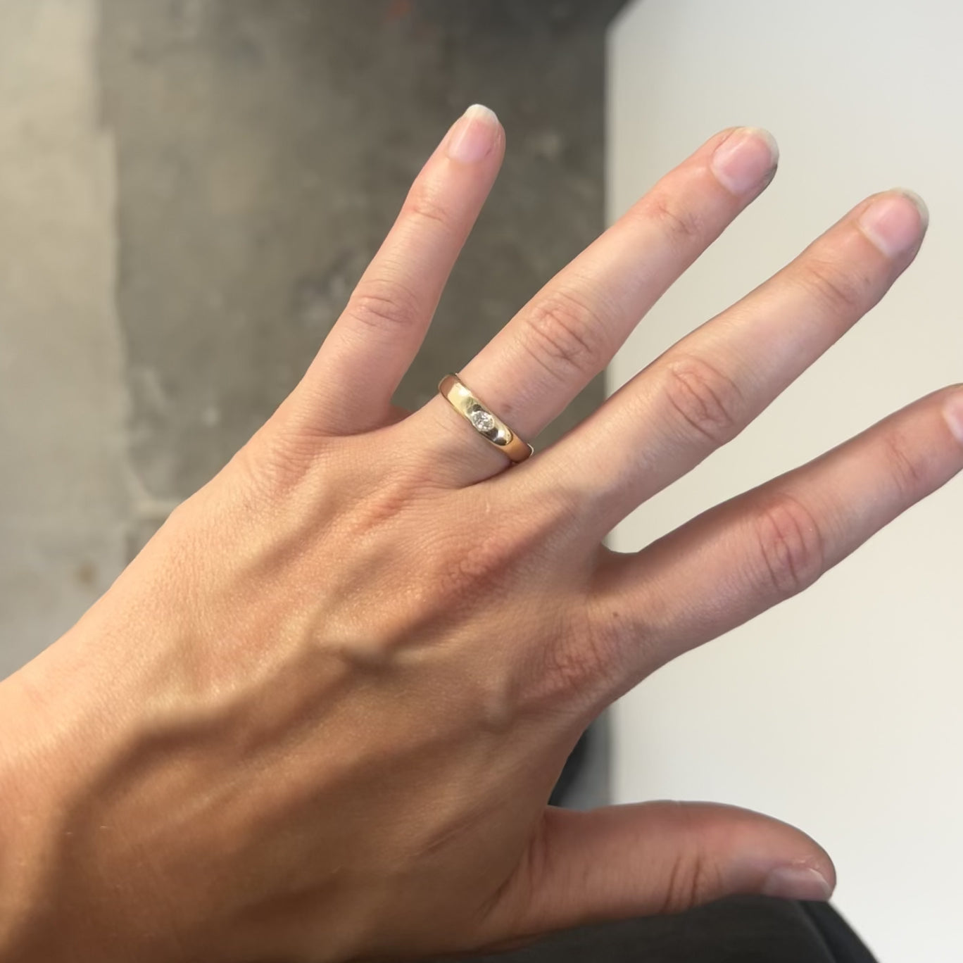 This ring is a chic and modern organic flat band with a east west flush set oval diamond. Whether its an engagement ring, wedding band, milestone birthday, push present or a special treat yourself moment - this is the perfect modern heirloom.